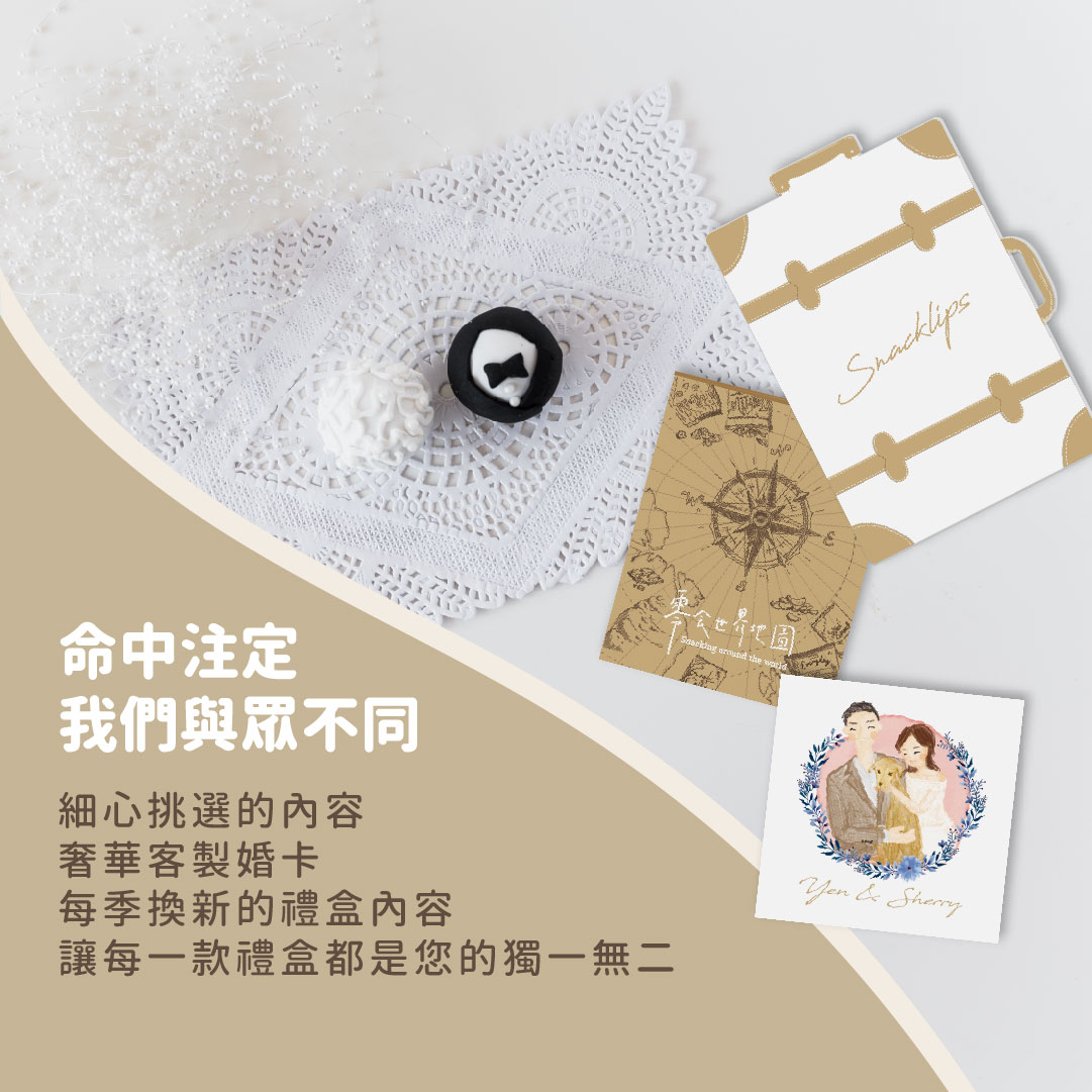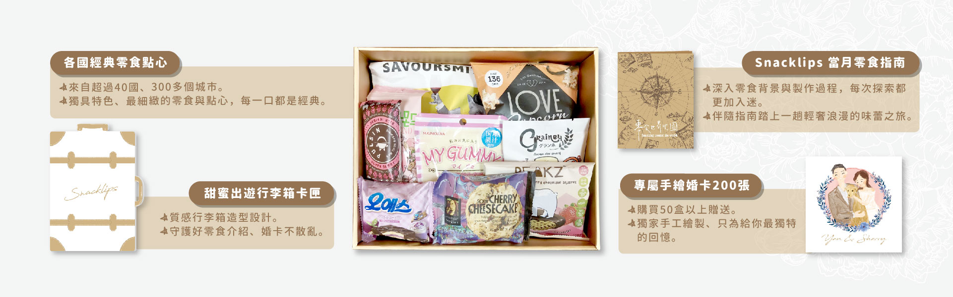 去年,跟在一起5年的男友兼工作夥伴決定結婚了,開始展開忙碌的婚禮籌備過程,有一天與朋友討論婚禮細節,她突然說 :「為何不使用你們家歪國零食嘴零食箱當做喜餅呢?」
