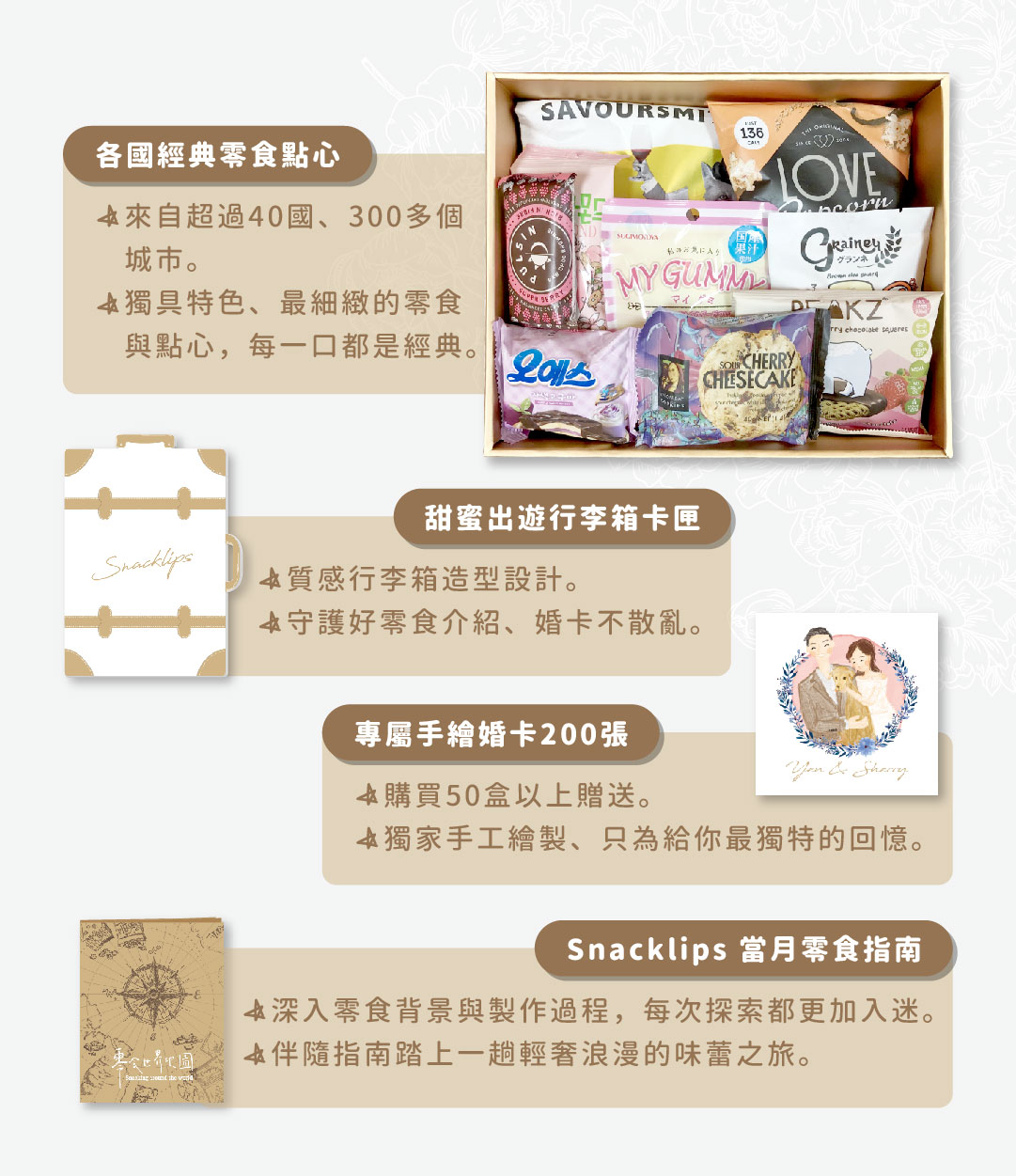 像是點醒了我,我希望我的家人朋友收到禮物時是感到驚奇又難忘,用異國零食打造喜餅,收到來自世界各地的祝福,這能夠讓婚禮不一樣